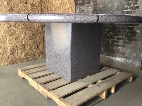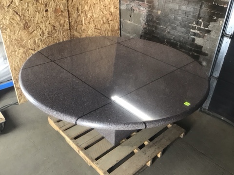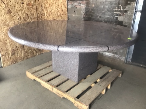 Table – Large Round Granite Top with Square Base – VERY HEAVY. Durable and stylish, perfect for indoor or outdoor use. Good condition with minimal wear. Bring help to move – this piece is solid stone!