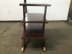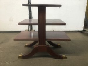 Vintage Lane Furniture 3 tier accent table. Federal style with a pair of double foot bases with brass toe caps, rounded edge details, mahogany veneer.