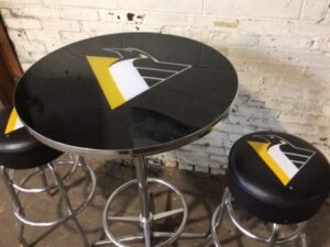 Rep your team today with this wonderful bistro table depicting the penguins logo in all its glory. Has been used so some wear to be expected but in good shape overall.