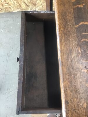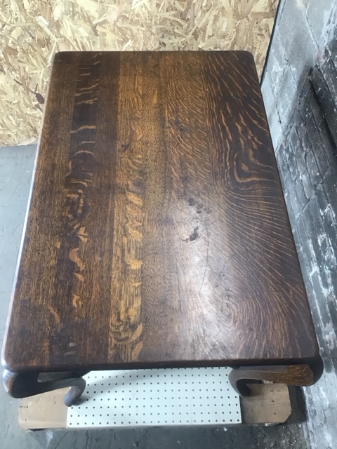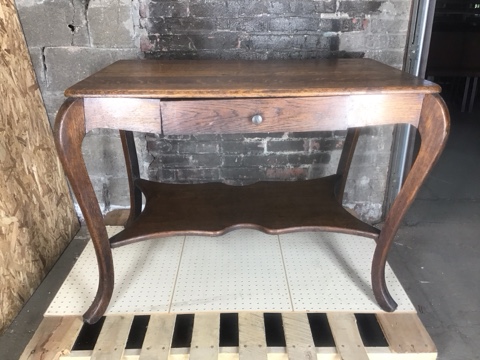 Quarter Sawn Oak Library Table with Drawer – 28″ L x 42.5″ W x 29″ H. Features elegant cabriole legs and timeless craftsmanship. Perfect as a vintage writing desk, side table, or accent piece.