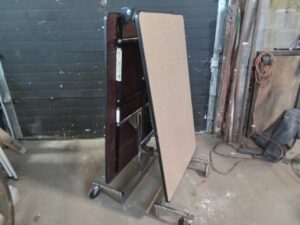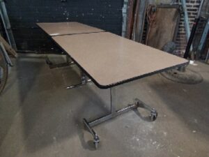 Rectangular folding table with casters. Has Laminate Top to easily clean and disinfect. Folded height: 57in Folded Width: 34in