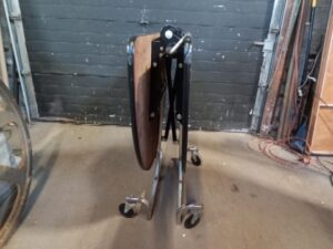Open height: 29 inches Round Folding Table on wheels. Becomes stationary when open. Has some wear on the top