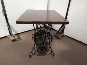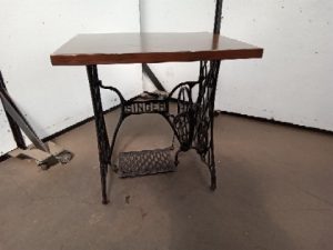 Cast-iron Treadle sewing machine base. Very thin laminated wood tops. Partial proceeds benefit The Blessing Board