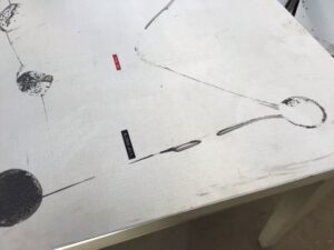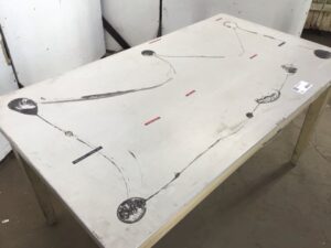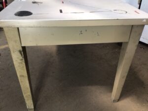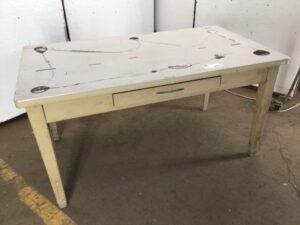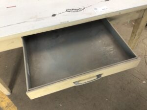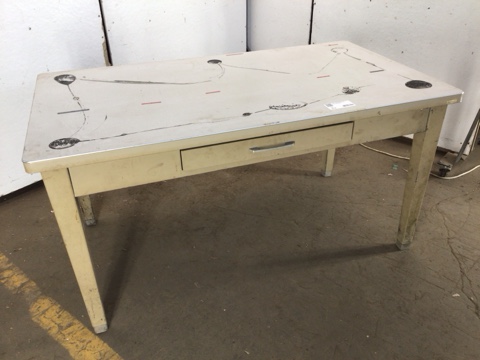 Vintage commercial work table – mid century style – single drawer – basket weave Formica top – solid steel base – this table is sturdy and has already survived over half a century – top has some scratches and left behind adhesive