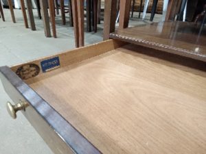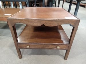 Two tier cherry table with drawer, stamped “Kittinger”. Slight damage.