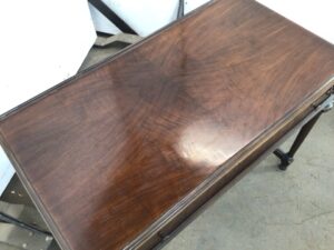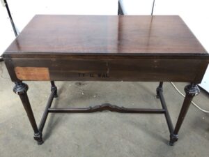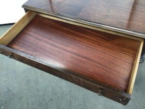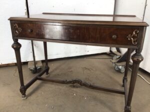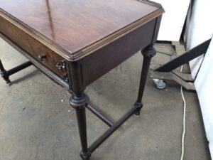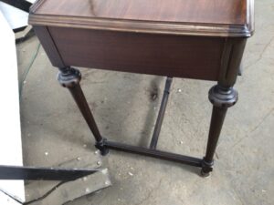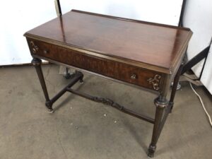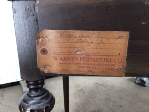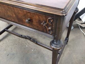 Antique side table with drawer made by the Warren furniture company – drawer front is figured maple – top surface is Bookmatched veneer – finish is in good shape with some wear on high spots and corners