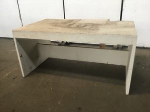 Hand built wooden work table with particle board top. White painted finish.