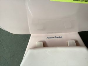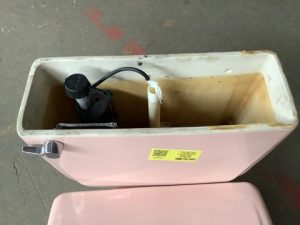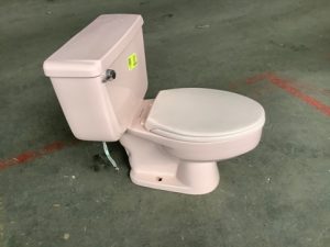 1964-69 American Standard Cadet model 2109 two piece toilet in Venetian Pink. 4049 tank with left-hand polished chrome lever, 5.0gpf, elongated bowl, 16” seat height.
