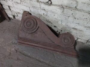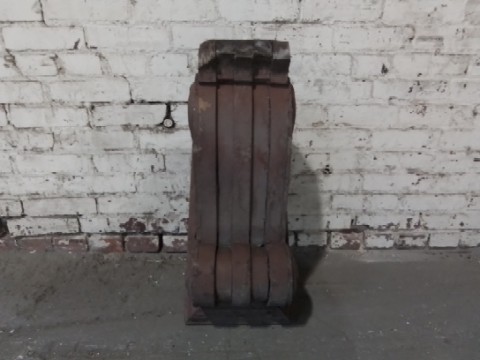 Vintage salvaged corbel in a rich reddish-brown hue. Stands 22″ tall and 10 1/2″ wide. Beautiful architectural piece with classic detailing. Perfect for restoration, shelving, or decorative accents. Shows wear, adding to its unique character.