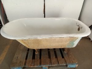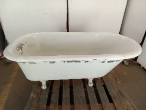 White, cast iron clawfoot tub salvaged by our deconstruction team. Good Condition