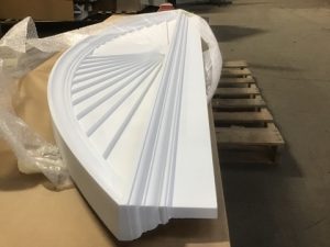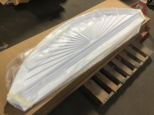 Combination arched top door/window pediment with crosshead. Raised sunburst top, cornice header, no bottom trim. Molded polyurethane, white primer finish. Lightweight, weather/insect resistant, interior/exterior use. Surplus, never previously installed.