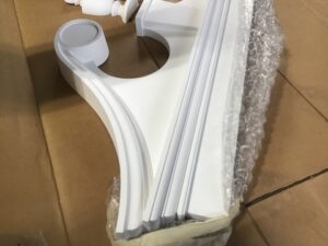 Combination rams head door/window pediment with crosshead. Twin scroll + finial, cornice header, no bottom trim. Molded polyurethane, white primer finish. Lightweight, weather/insect resistant, interior/exterior use. Surplus, never previously installed.