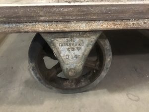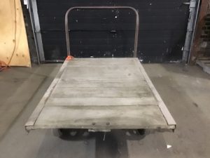 Vintage Fairbanks Co. platform truck factory cart. Wooden deck with steel edge binding and tubular handle (not removable). Large rubber fixed front wheels and rear turning casters.