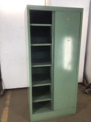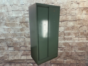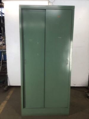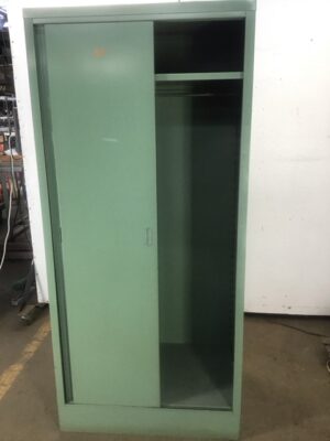 Industrial-style green steel wardrobe/armoire with sliding doors. Sturdy and stylish, perfect for storage. In good condition with a sleek, modern touch. Ideal for lofts, offices, or homes seeking a functional yet trendy piece.
