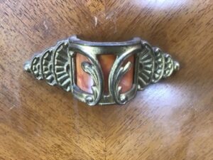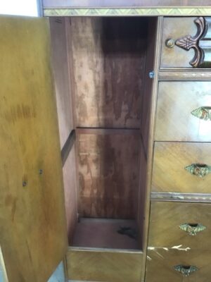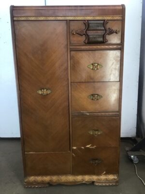 Vintage Waterfall-style wardrobe/armoire with classic Art Deco brass & Bakelite pulls. Shows character with some scratches and chipped veneer. A timeless piece with elegant curves and vintage charm!