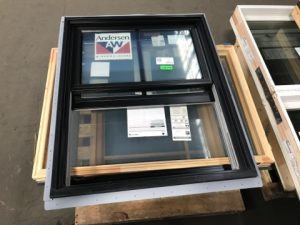 Andersen double hung window, vinyl clad with wood frame. Black interior and exterior, 2 lite style sashes with internal grids. Surplus item, never previously installed.