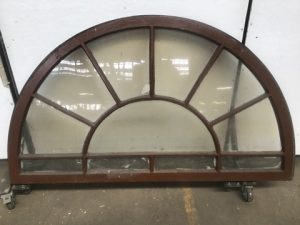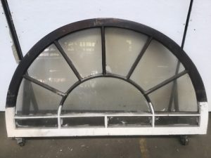 Reclaimed vintage window sash. 1 3/4in thick wooden frame with 11 individual divided lites in a sunburst style muntin pattern. Well weathered but in good condition, 2 cracked panes. Salvaged by our deconstruction crew.