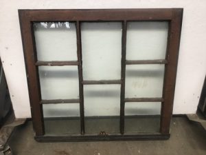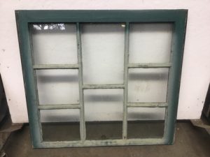 Antique window sash, 8 lite plain wavy glass in an offset pattern, 2 rows of 3 and center row of 2. 1 1/2″ thick wooden frame, green painted exterior, heavily weathered. Salvaged by our deconstruction crew.
